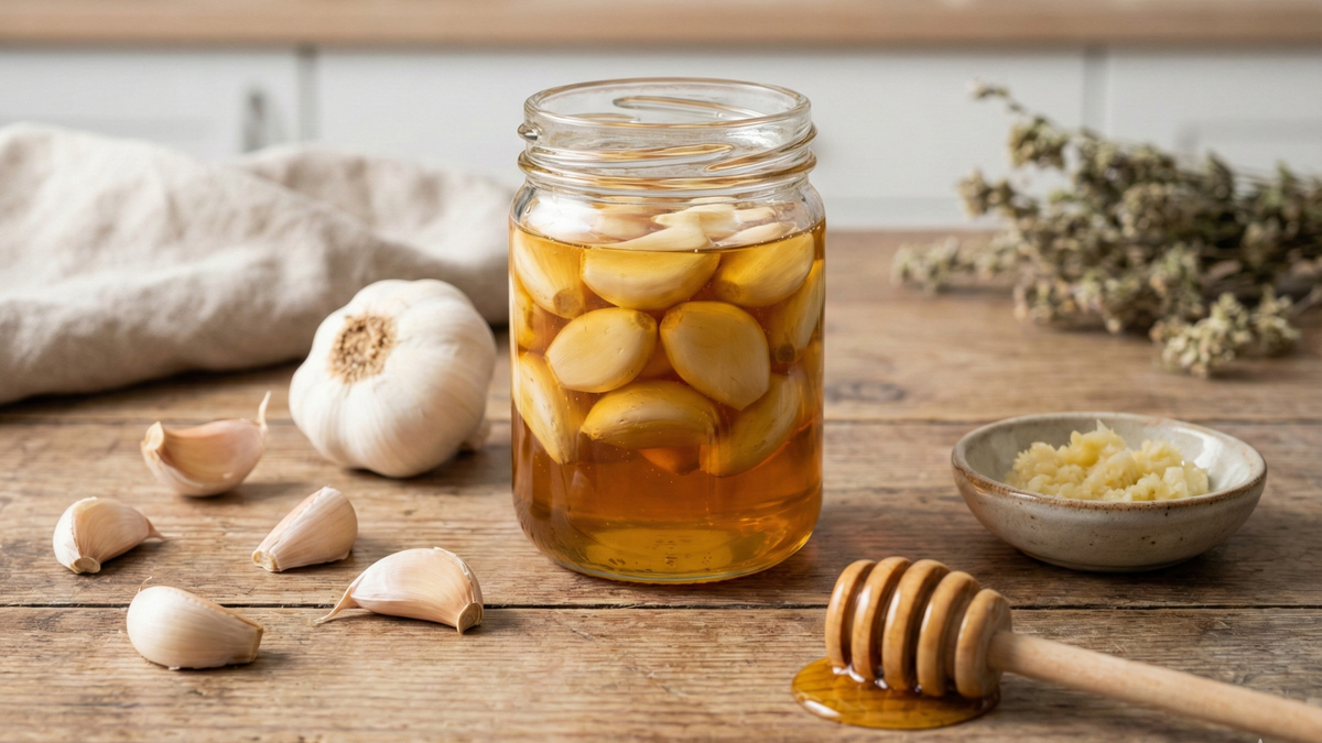 In real kitchens, this pairing tends to be simple and repeatable — not elaborate. Some people mix a small amount of crushed garlic into a teaspoon of honey and take it once daily in winter. Others prefer a fermented jar because the garlic becomes milder and the honey thins into a pourable syrup, which many find easier to use.