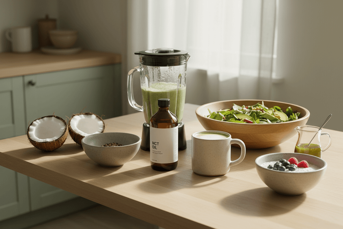 MCT oil makes keto feel smoother—especially when you place teaspoons (not tablespoons) into real meals. Blend powder for creamy drinks, drizzle liquid into dressings and bowls, and keep vegetables, protein and olive oil at the centre of your plate. Consistency beats complexity.