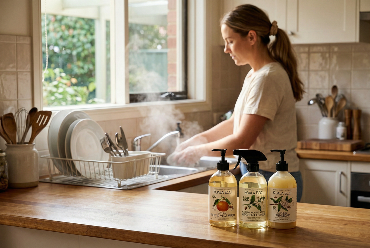 For this review, we focus on the workhorse products most Australian households actually reach for: the Multi-Purpose Kitchen Cleaner, Multi-Purpose Bathroom Cleaner, Floor Cleaner, Dish Soap and Fruit & Vegetable Wash. Together, these cover the bulk of everyday cleaning tasks and provide a realistic picture of how Koala Eco performs across different rooms and surfaces.